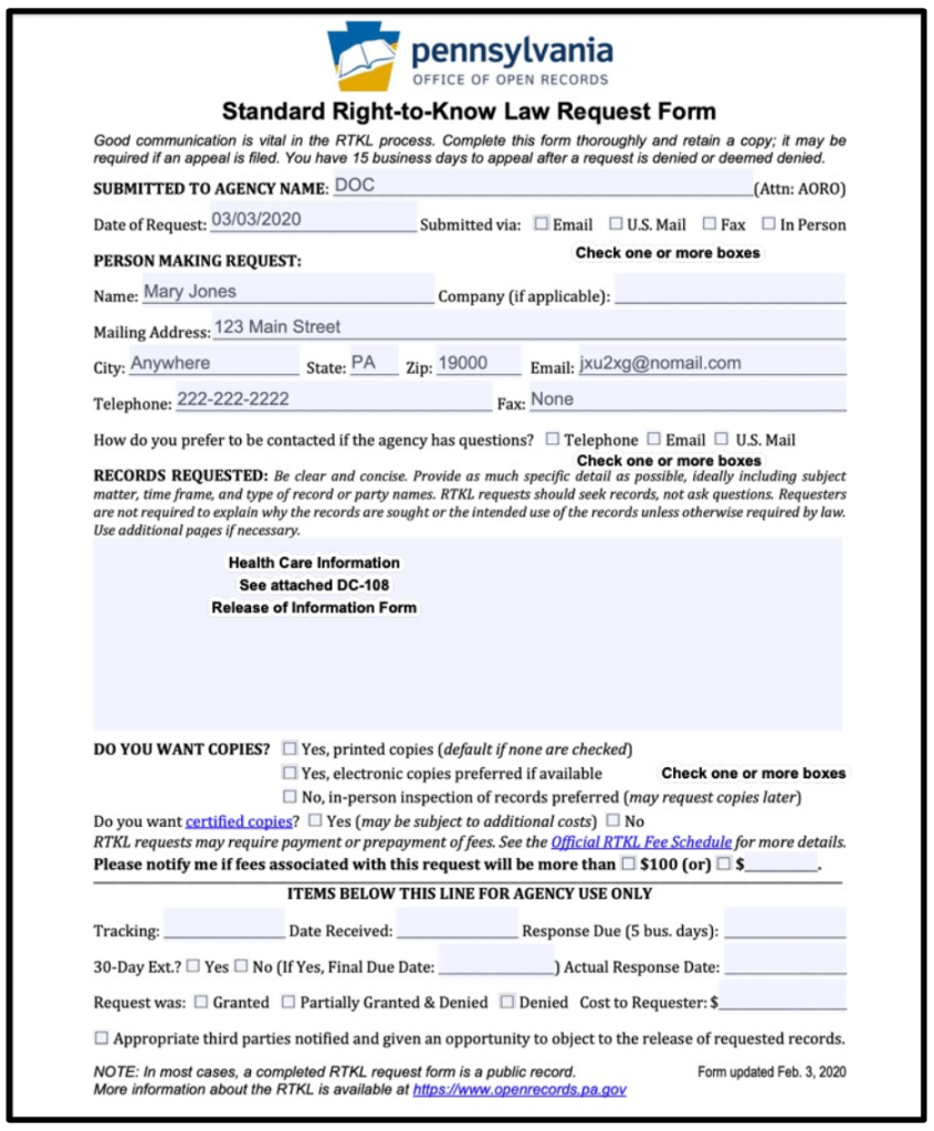 - Obtain PA Standard Right to Know Form from openrecords.pa.gov.